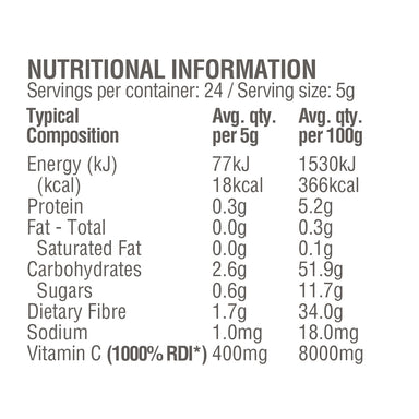 Immunity & BeautyA non-synthetic formula with 1000% RDI wholefood vitamin C per serve made from certified organic Baobab, Camu Camu, Orange, G...