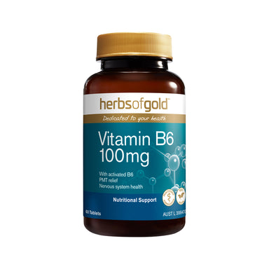 Herbs of Gold Vitamin B6 100mg contains a blend of pyridoxine and pyridoxial 5-phosphate monohydrate (activated B6), in a convenient one-a-day tab...