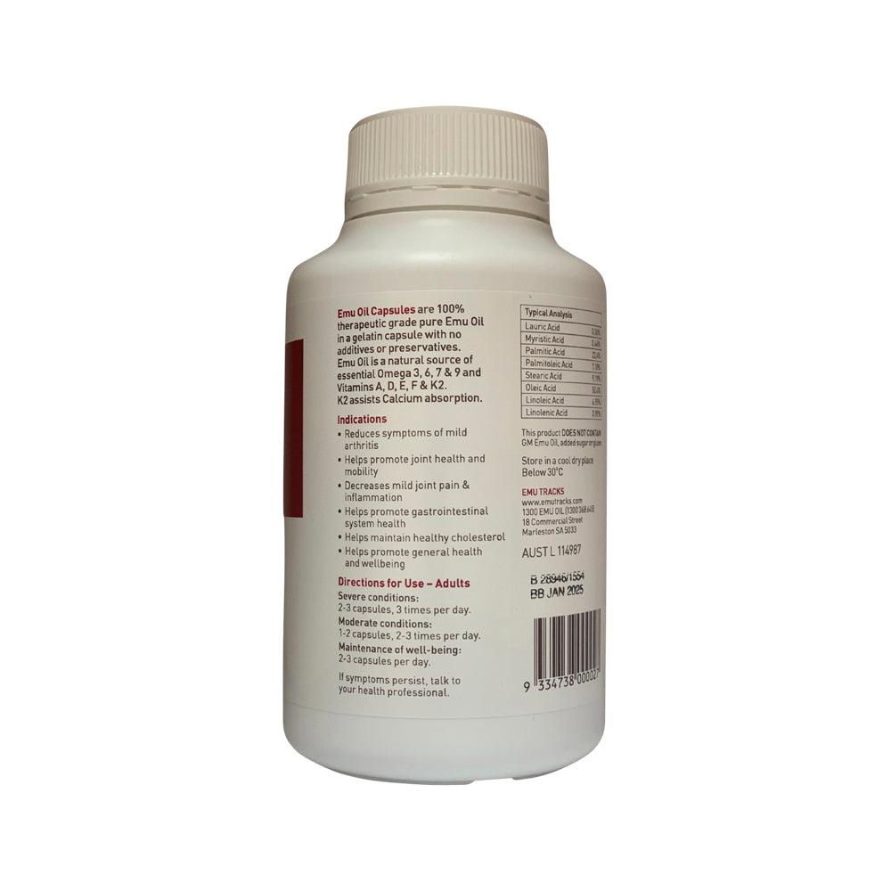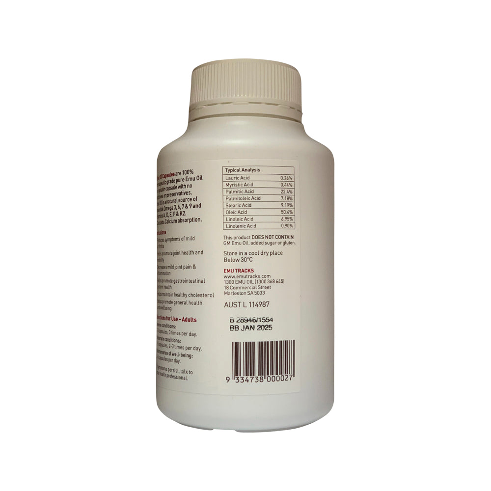 Emu Oil Capsules are 100% pure Emu Oil with no additives or preservatives. Emu Oil is a natural source of essential Omega 3, 6, 7 & 9 and Vitamins A, D, E, F & K2.